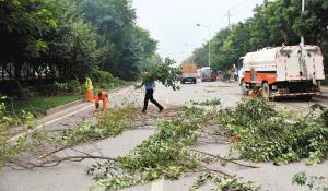 保潔員和民警一起清理路面上的樹枝 記者 王健攝