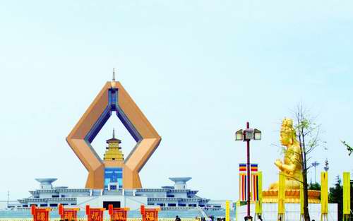 初到法門寺佛文化景區(qū)的游客,都會(huì)被景區(qū)建設(shè)的恢弘氣勢所震撼:氤氳籠罩中的噴泉與石荷,兩排惟妙惟肖的石質(zhì)大象和獅子,磅礴的佛光門、般若門、菩提門和圓融門,以及金碧輝煌的合十舍利塔大殿……從般若門筆直望去,一公里外的合十舍利塔不太像手,倒像含苞待放的蓮蕊。
