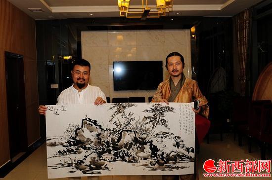 文昌書畫社社長(zhǎng)、陜西雙擁書畫院山水畫研究會(huì)會(huì)長(zhǎng)鄭虔(左)水墨山水。