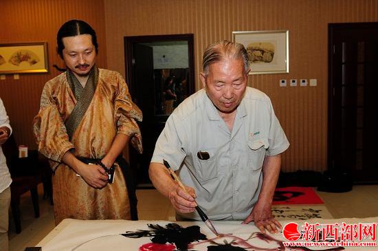 陜西書畫家協(xié)會(huì)副主席著名書畫家趙武(中)即興創(chuàng)作“花好月圓”
