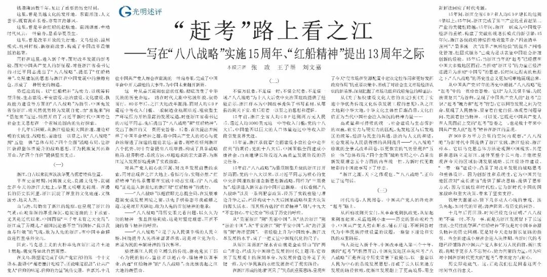 十幾年后再回顧,時間已經(jīng)充分證明,“八八戰(zhàn)略”不謀一時、不為一事,而是為浙江發(fā)展留下了長遠(yuǎn)性的、全局性的擘畫;“紅船精神”不僅是對中國革命源頭精神的歷史回溯,更是對今天走好新長征路的指引。當(dāng)全面建成小康社會進(jìn)入決勝期,當(dāng)新時代的考題已經(jīng)鋪陳在中國共產(chǎn)黨人和億萬人民面前,浙江實踐,將賦予更多人不忘初心、勠力向前的力量,將為應(yīng)對中國在新時代更大的“趕考”,帶來定力與耐心。