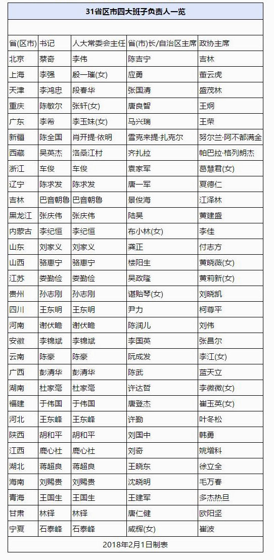 附:2018年省級(jí)地方兩會(huì)后各地四大班子負(fù)責(zé)人一覽: