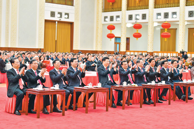 黨和國家領導人李克強、張德江、俞正聲、張高麗、栗戰(zhàn)書、汪洋、王滬寧、趙樂際、韓正等出席團拜會,李克強主持。