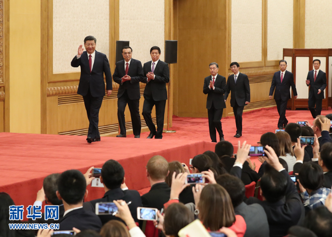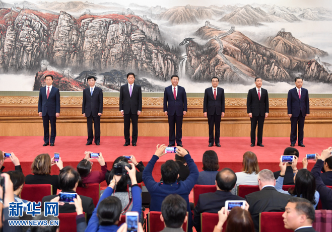 現(xiàn)在,我向大家介紹一下當(dāng)選的其他6位常委同事:李克強(qiáng)同志、栗戰(zhàn)書(shū)同志、汪洋同志、王滬寧同志、趙樂(lè)際同志、韓正同志。其中,李克強(qiáng)同志是十八屆中共中央政治局常委,其他五位同志都是十八屆中共中央政治局委員,大家可以通過(guò)媒體渠道獲得更多有關(guān)他們的資料。
