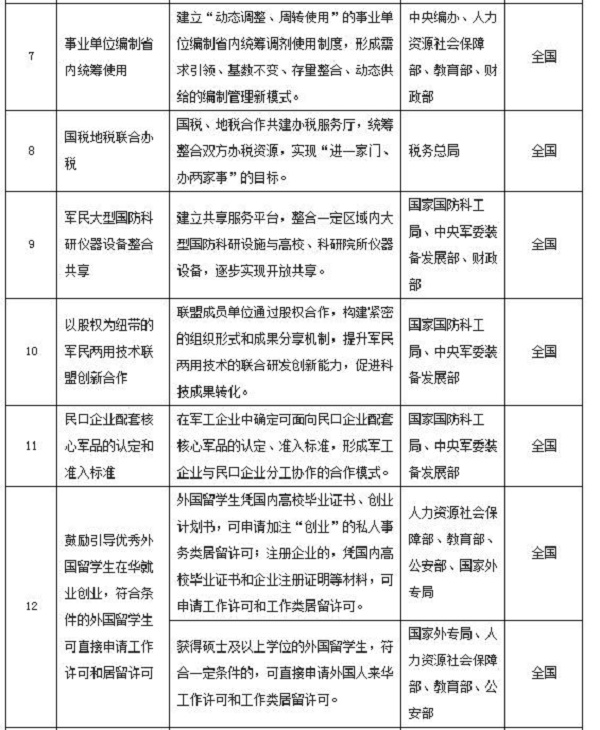 為深入實(shí)施創(chuàng)新驅(qū)動(dòng)發(fā)展戰(zhàn)略,黨中央、國(guó)務(wù)院確定在京津冀、上海、廣東(珠三角)、安徽(合蕪蚌)、四川(成德綿)、湖北武漢、陜西西安、遼寧沈陽(yáng)等8個(gè)區(qū)域開(kāi)展全面創(chuàng)新改革試驗(yàn),推進(jìn)相關(guān)改革舉措先行先試,著力破除制約創(chuàng)新發(fā)展的體制機(jī)制障礙。有關(guān)地區(qū)和部門(mén)認(rèn)真落實(shí)黨中央、國(guó)務(wù)院決策部署,在深化科技體制改革、提升自主創(chuàng)新能力、優(yōu)化創(chuàng)新創(chuàng)業(yè)環(huán)境等方面進(jìn)行了大膽探索,形成了一批支持創(chuàng)新的相關(guān)改革舉措。為進(jìn)一步加大支持創(chuàng)新的力度,營(yíng)造有利于大眾創(chuàng)業(yè)、萬(wàn)眾創(chuàng)新的制度環(huán)境和公平競(jìng)爭(zhēng)市場(chǎng)環(huán)境,為創(chuàng)新發(fā)展提供更加優(yōu)質(zhì)的服務(wù),經(jīng)國(guó)務(wù)院批準(zhǔn),將有關(guān)改革舉措在全國(guó)或8個(gè)改革試驗(yàn)區(qū)域內(nèi)推廣?,F(xiàn)就有關(guān)事項(xiàng)通知如下: