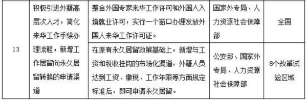 (三)外籍人才引進(jìn)方面2項(xiàng):“鼓勵(lì)引導(dǎo)優(yōu)秀外國(guó)留學(xué)生在華就業(yè)創(chuàng)業(yè),符合條件的外國(guó)留學(xué)生可直接申請(qǐng)工作許可和居留許可”、“積極引進(jìn)外籍高層次人才,簡(jiǎn)化來(lái)華工作手續(xù)辦理流程,新增工作居留向永久居留轉(zhuǎn)換的申請(qǐng)渠道”。