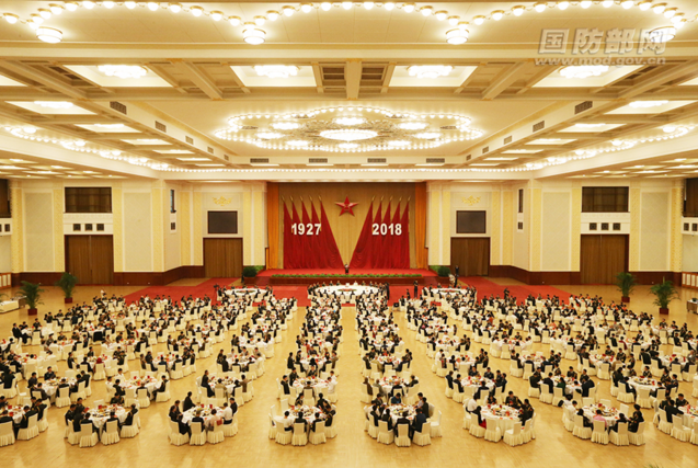 人民大會堂燈火輝煌、鮮花綻放,中外嘉賓歡聚一堂、共慶節(jié)日。主席臺帷幕中央懸掛著巨型“八一”軍徽,十面鮮艷的紅旗分立兩側(cè)?!?927—2018”醒目的大字熠熠生輝,昭示著中國人民解放軍走過了91年的光輝歲月,走進新時代,踏上新征程。