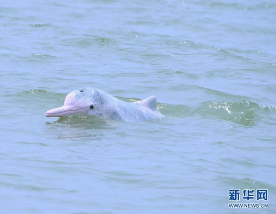 廣西欽州市三娘灣海域,一頭野生中華白海豚在自由嬉戲,萌態(tài)十足(6月10日攝)。新華社記者 周華 攝