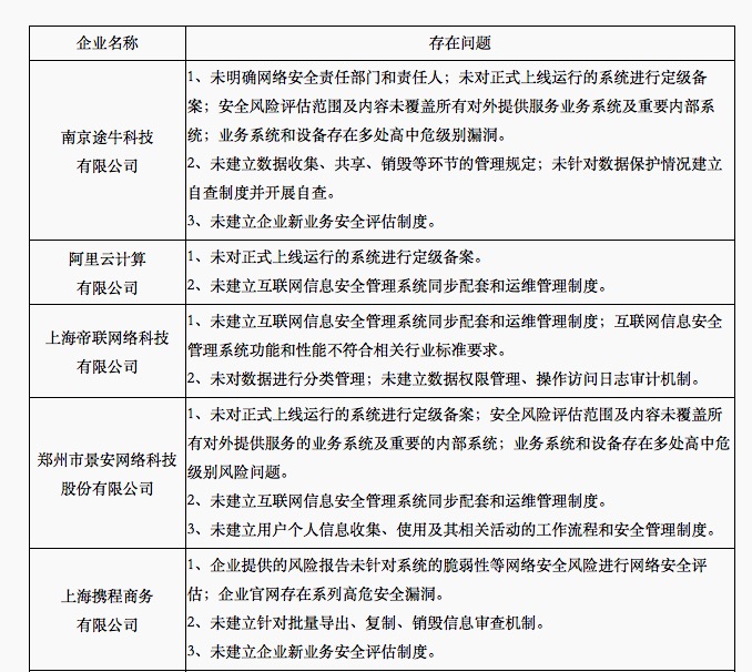 11月27日,工業(yè)和信息化部發(fā)布網(wǎng)絡(luò)安全管理局對7家電信企業(yè)網(wǎng)絡(luò)與信息安全檢查結(jié)果,結(jié)果顯示南京途牛科技有限公司(下稱途牛)、阿里云計算有限公司(下稱阿里云)、上海帝聯(lián)網(wǎng)絡(luò)科技有限公司、鄭州市景安網(wǎng)絡(luò)科技股份有限公司、上海攜程商務(wù)有限公司(下稱攜程)、武漢長城寬帶網(wǎng)絡(luò)服務(wù)有限公司(下稱長城寬帶)、成都西維數(shù)碼科技有限公司這7家企業(yè)均存在問題。