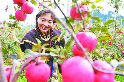 消費扶貧讓超億元優(yōu)質(zhì)農(nóng)產(chǎn)品出藏。圖為西藏林芝市米林縣羌納鄉(xiāng)林巴村村民在果園里摘蘋果。新華社發(fā)