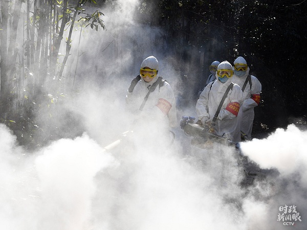 △2020年2月,安徽亳州市,環(huán)衛(wèi)黨員突擊隊隊員對社區(qū)進行防疫消殺。