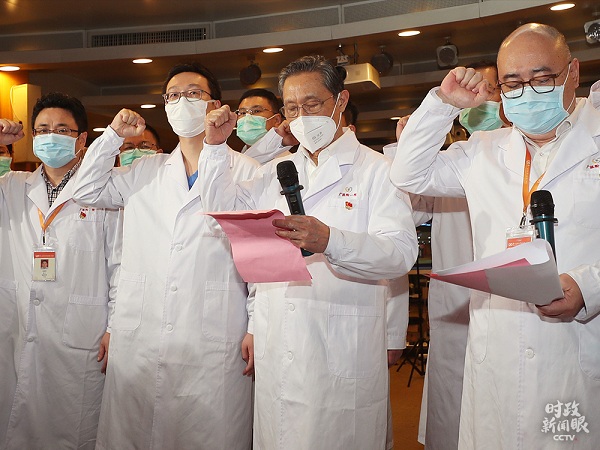 △2020年3月2日,廣州醫(yī)科大學附屬第一醫(yī)院,鐘南山院士(右二)在首批戰(zhàn)“疫”一線火線發(fā)展黨員的入黨宣誓儀式上領(lǐng)誓。