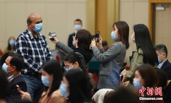 3月3日,全國政協(xié)十三屆四次會議新聞發(fā)布會在北京舉行。圖為一名巴基斯坦記者在發(fā)布會開始前,在設在北京梅地亞中心多功能廳的分會場內(nèi)接受采訪。 中新社記者 杜洋 攝