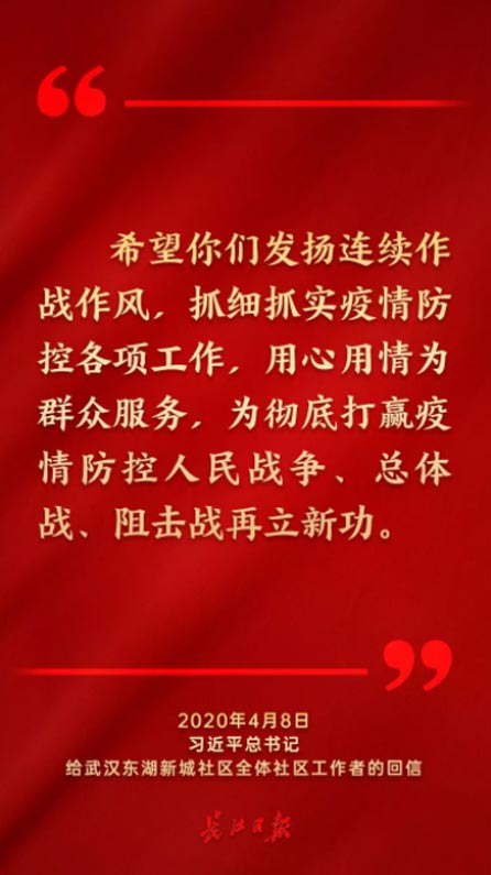 大城重啟,總書記給武漢東湖新城社區(qū)全體工作人員回信,希望他們用心用情為群眾服務(wù),再立新功。