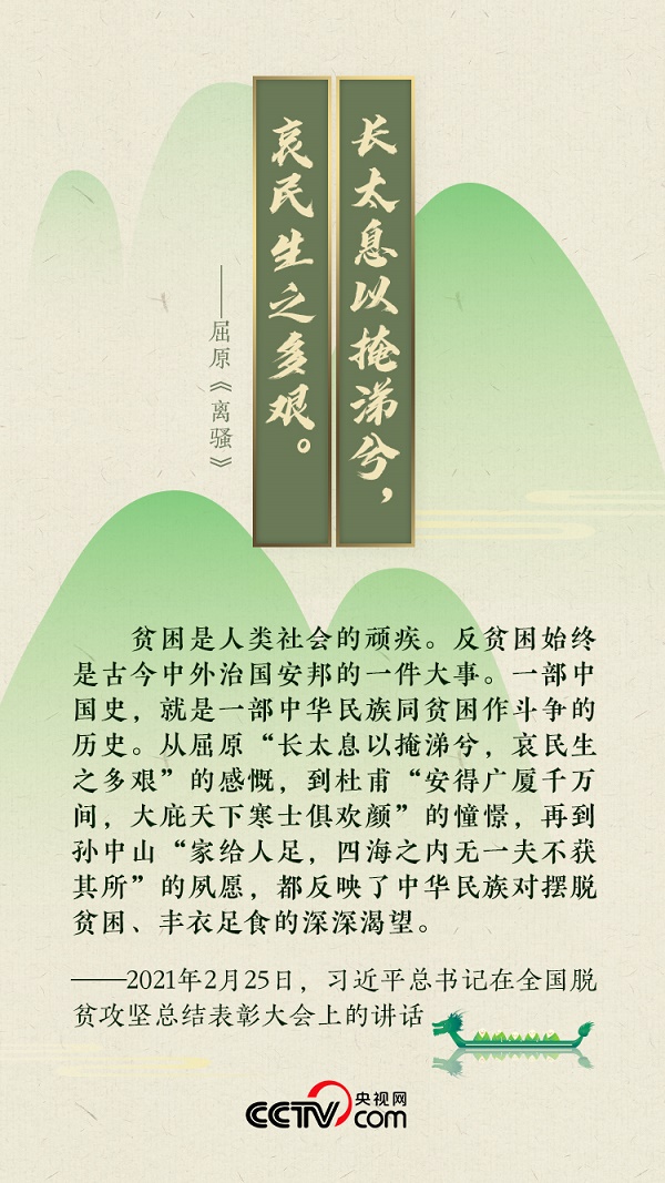 2021年2月25日,習(xí)近平總書記在全國(guó)脫貧攻堅(jiān)總結(jié)表彰大會(huì)上吟誦屈原悲嘆民生不興的詩(shī)句“長(zhǎng)太息以掩涕兮,哀民生之多艱”。
