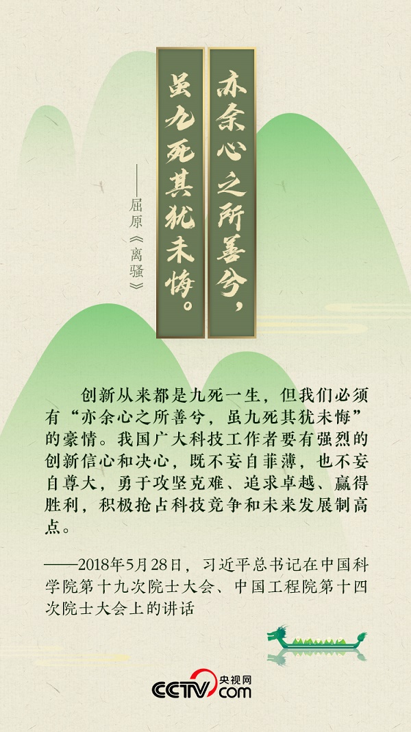 “創(chuàng)新從來(lái)都是九死一生?!?018年5月,在中國(guó)科學(xué)院第十九次院士大會(huì)、中國(guó)工程院第十四次院士大會(huì)開幕會(huì)上,習(xí)近平總書記引用屈原的“亦余心之所善兮,雖九死其猶未悔”鼓勵(lì)廣大科技工作者勇于攻堅(jiān)克難、追求卓越、贏得勝利。