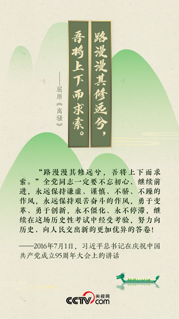 2016年7月,在慶祝中國(guó)共產(chǎn)黨成立95周年大會(huì)上,習(xí)近平總書記娓娓道出屈原的名句“路漫漫其修遠(yuǎn)兮,吾將上下而求索”,號(hào)召全黨同志不忘初心,勇于變革創(chuàng)新,繼續(xù)前進(jìn)。