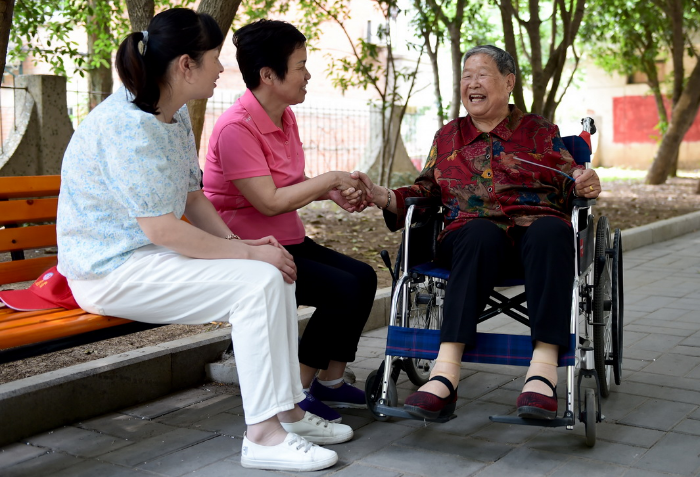 ▲6月9日,在安徽省合肥市蜀山區(qū)西園街道,馬毛姐(右一)和社區(qū)居民交談。新華社記者 黃博涵 攝