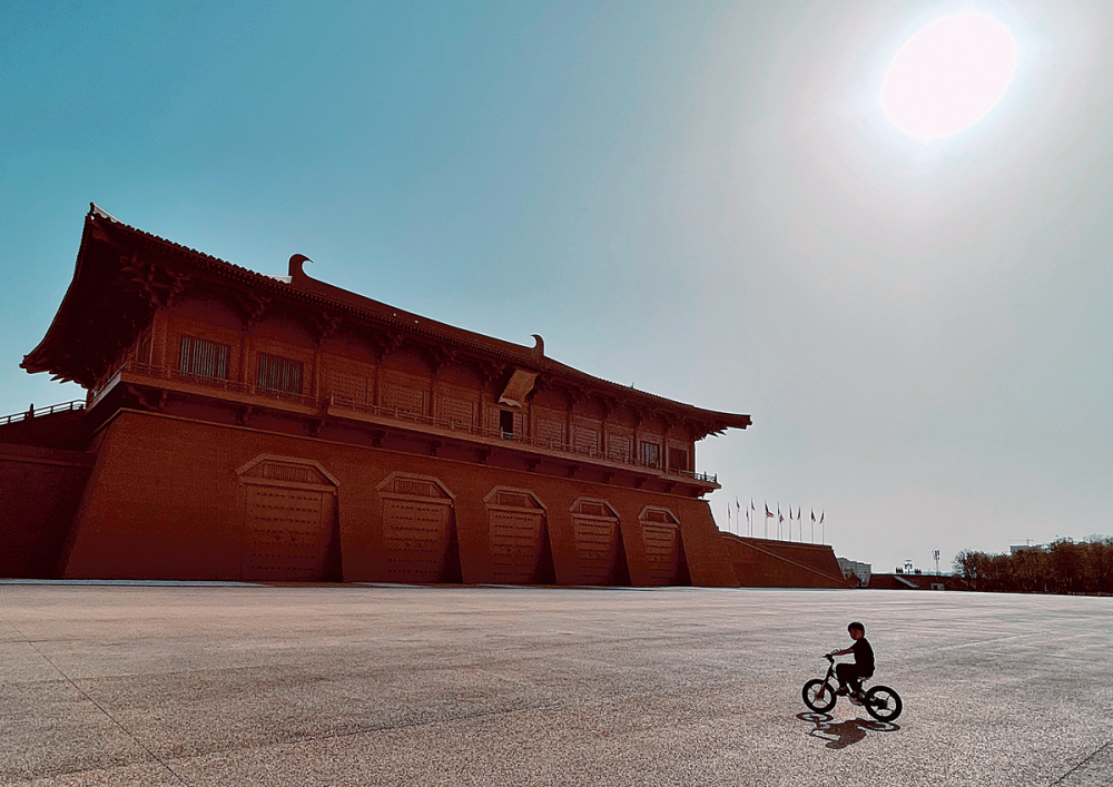 2022年4月10日,一名孩童在西安大明宮國家遺址公園丹鳳門前騎行 劉瀟攝/本刊