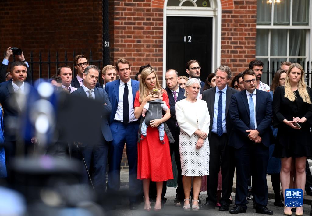 7月7日,英國首相鮑里斯·約翰遜的妻子卡麗(前排紅裙者)抱著孩子觀看約翰遜在倫敦唐寧街10號門前發(fā)表講話。 新華社記者 李穎 攝