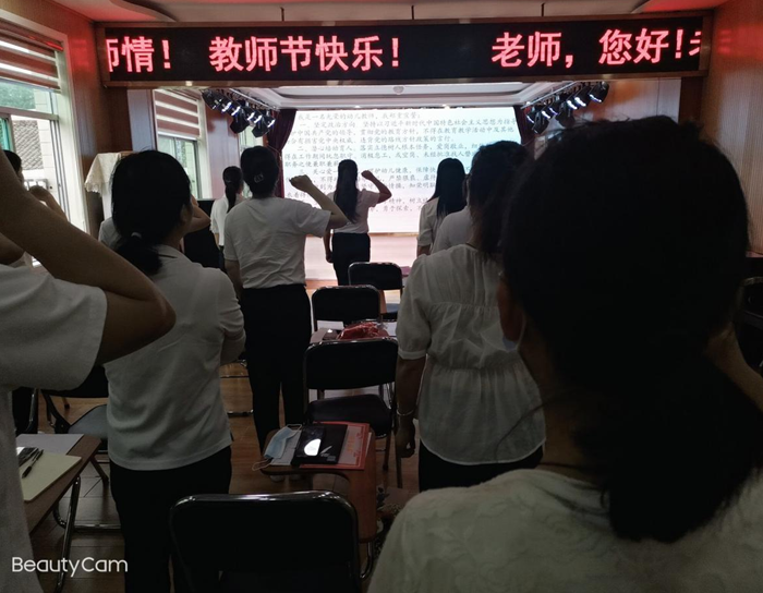 一份承諾,一份責(zé)任;一份宣誓,一份使命。全體教職工在《師德師風(fēng)承諾書》《拒絕有償家教承諾書》上鄭重簽署了自己的名字,教師們舉起右手,握拳在肩莊嚴(yán)宣誓?,F(xiàn)場鏗鏘有力的誓言,莊嚴(yán)隆重的氣氛感染著每一位教師,高度的責(zé)任感、使命感、榮譽(yù)感油然而生。