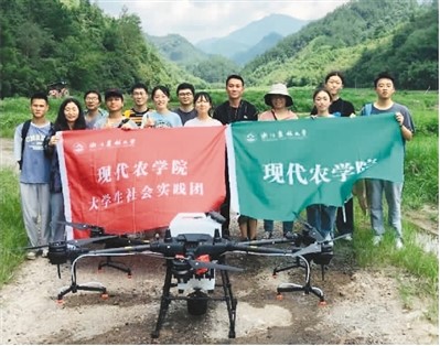 2021年7月,浙江農(nóng)林大學“植物醫(yī)生”大學生暑期社會實踐團到杭州市一個水稻基地,提供植保無人機噴藥服務(wù)。浙江農(nóng)林大學供圖