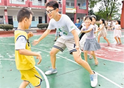 2022年暑期,武漢大學的大學生志愿者來到江西省南昌市灣里管理局羅亭鎮(zhèn)義坪小學參加“童心港灣”關(guān)愛留守兒童活動。圖為志愿者和留守兒童一起做游戲。新華社發(fā)