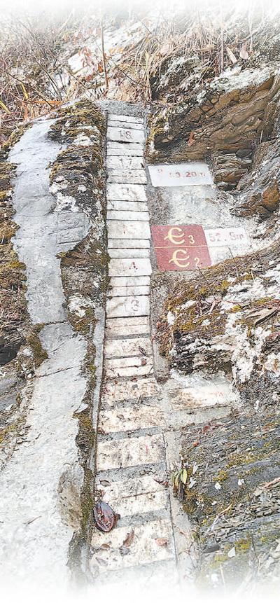 沿石梯小道拾級(jí)而上,臨近山頂一處坡面上,由白色瓷磚砌成的地質(zhì)層位標(biāo)識(shí)柱已顯斑駁。而右邊兩塊暗紅色瓷磚依舊醒目,一條金色分隔線上下,可以清晰地看到鐫刻著兩組字符——前者代表寒武系第三統(tǒng),后者代表寒武系第二統(tǒng)。