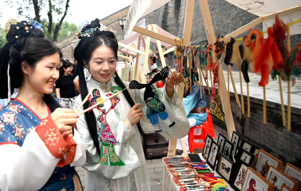 ▲9月12日,西安市新城區(qū)“遇見城墻·非遺韻”非遺集市上,游客在了解陜西皮影。新華社記者 劉瀟 攝