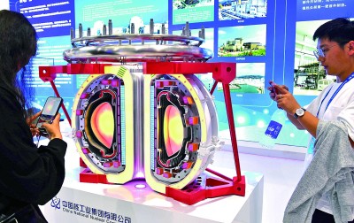 日前,在2023綠色低碳高質(zhì)量發(fā)展大會裝備展上,參觀者在觀看中國環(huán)流三號可控核聚變實驗裝置模型。新華社記者 徐速繪攝