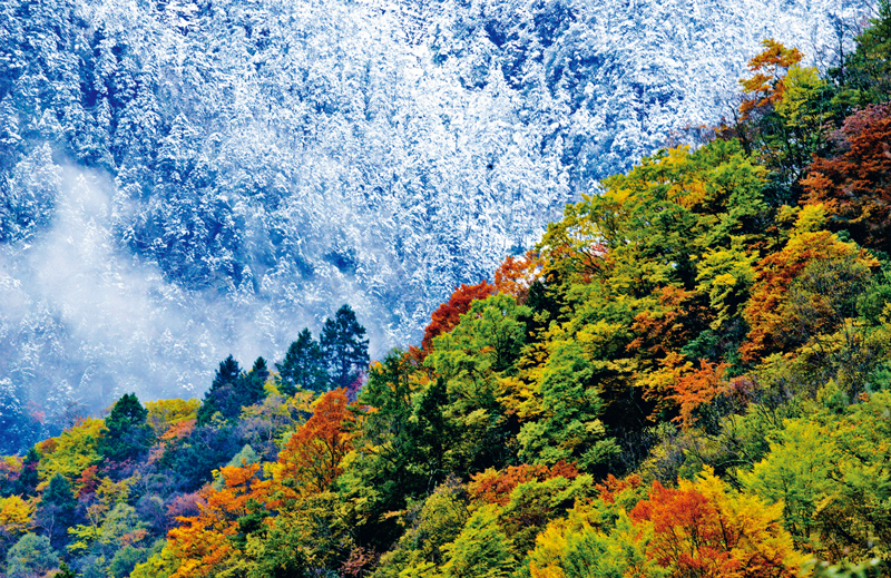 大熊貓國(guó)家公園地處我國(guó)第一級(jí)階梯與第二級(jí)階梯分界線、亞熱帶季風(fēng)氣候區(qū)與青藏高寒區(qū)過渡帶,植被垂直帶分布明顯,地形地貌復(fù)雜多樣。2020年10月中下旬,大熊貓國(guó)家公園唐家河片區(qū)萬(wàn)山紅遍、層林盡染,而高海拔地區(qū)迎來(lái)較早降雪,近處低海拔與遠(yuǎn)處高海拔的山坡在視線交錯(cuò)中演繹出冰火兩重天的壯美景象。大熊貓國(guó)家公園管理局供圖 陶劍/攝