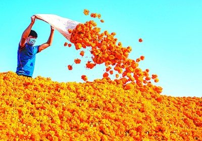 新疆于田縣農(nóng)民將稱(chēng)重后的萬(wàn)壽菊倒入發(fā)酵池。新華社發(fā)