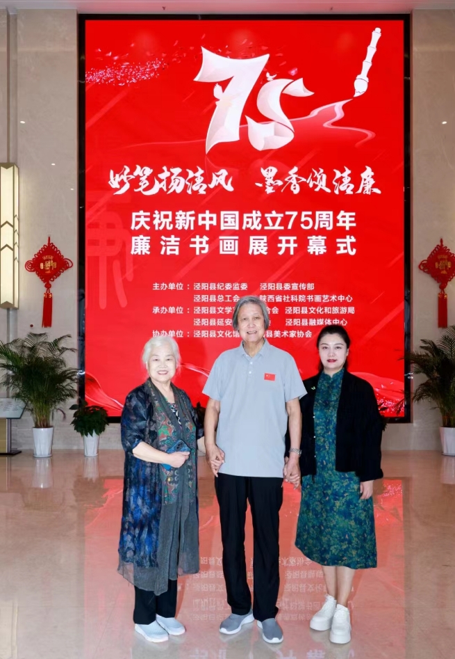 ▲涇陽(yáng)籍著名書(shū)法家張鴻鈞(中)攜夫人史惠芳(畫(huà)家)、女兒張雨菲(書(shū)法家)應(yīng)邀參加啟動(dòng)儀式。