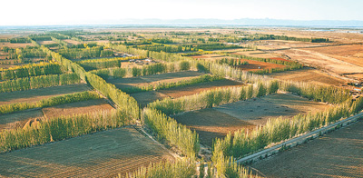 位于烏蘭布和沙漠內(nèi)中國林科院沙漠林業(yè)實驗中心的農(nóng)田林網(wǎng)。