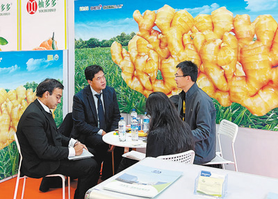 在2025年德國柏林國際果蔬展覽會上,山東省三慧食品有限公司工作人員向當(dāng)?shù)乜蜕掏平榘睬鸫蠼?strong>魯蘭德·斯特凡攝