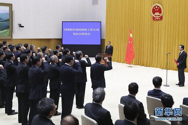 4月16日,新一屆國務(wù)院在北京中南海舉行憲法宣誓儀式。國務(wù)院總理李克強(qiáng)監(jiān)誓。新華社記者 丁林 攝
