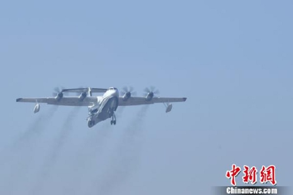 24日,由中國(guó)航空工業(yè)自主研發(fā)的國(guó)產(chǎn)首款大型水陸兩棲飛機(jī)“鯤龍”AG600在珠海金灣機(jī)場(chǎng)成功首飛。 陳驥旻 攝