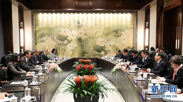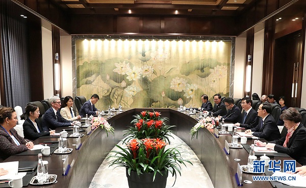 12月3日,中共中央政治局常委、中央書記處書記王滬寧在浙江烏鎮(zhèn)會見出席第四屆世界互聯(lián)網(wǎng)大會的思科公司首席執(zhí)行官羅卓克。新華社記者龐興雷攝