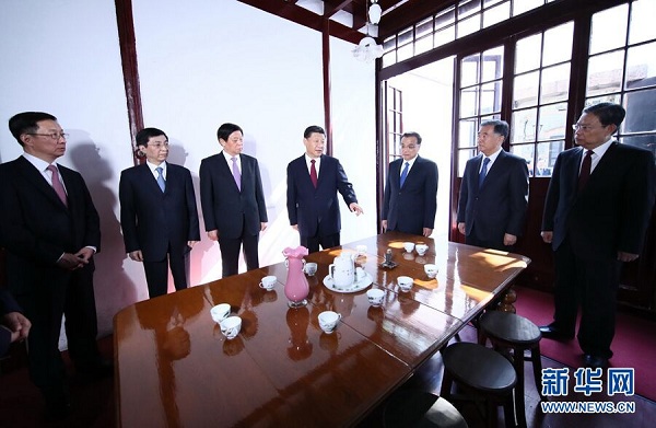 習近平等在興業(yè)路下車后,步行來到中共一大會址紀念館。習近平在上海工作期間曾3次到這里。在這里,習近平首先瞻仰了中共一大會議室原址。這個18平方米的房間按照當年會議場景復(fù)原布置。習近平久久凝視,叮囑一定要把會址保護好、利用好。習近平動情地說,毛澤東同志稱這里是中國共產(chǎn)黨的“產(chǎn)床”,這個比喻很形象,我看這里也是我們中國共產(chǎn)黨人的精神家園。