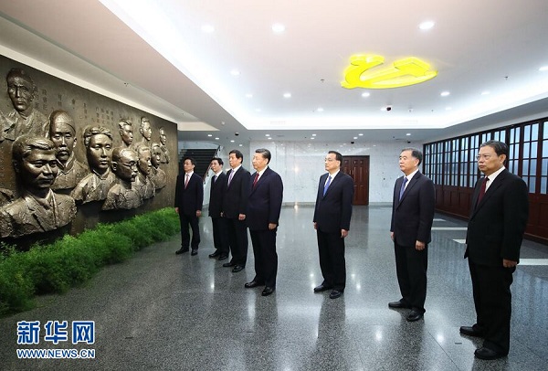 隨后,習近平等瞻仰了中共一大代表群像浮雕,參觀了《偉大開端——中國共產(chǎn)黨創(chuàng)建歷史陳列》。“前赴后繼、救亡圖存”、“風云際會、相約建黨”、“群英匯聚、開天辟地”等專題展區(qū),陳列著大量實物和圖片,有的還有雕塑和沙盤,習近平一邊聽取介紹,一邊詢問細節(jié)。他對著浮雕一一列數(shù)中共一大13名代表的姓名,感嘆英雄輩出,也感嘆大浪淘沙。習近平指出,建黨時的每件文物都十分珍貴、每個情景都耐人尋味,我們要經(jīng)?;貞?、深入思索,從中解讀我們黨的初心。