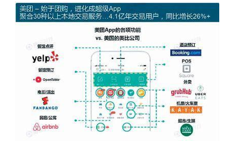 始于團購、進化為“啥都有”的美團吸引了該報告的關注。打開美團APP,可以看到餐館點評、餐館預訂、電影及演出預訂、酒店預訂以及外賣等30種以上的功能,就像將美國的Yelp、OpenTable、airbnb、Booking、grubHub等聚合在一起。