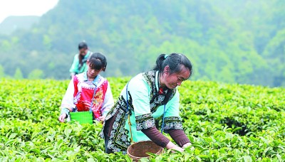 三都縣茶農(nóng)正在采摘新茶。韋榮整攝/光明圖片