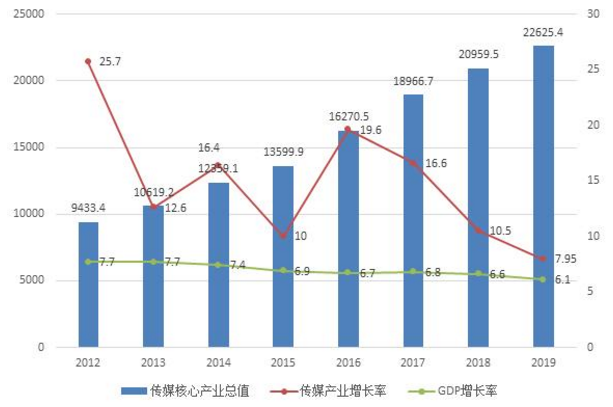 2012~2019年中國傳媒產(chǎn)業(yè)總值與年增長率