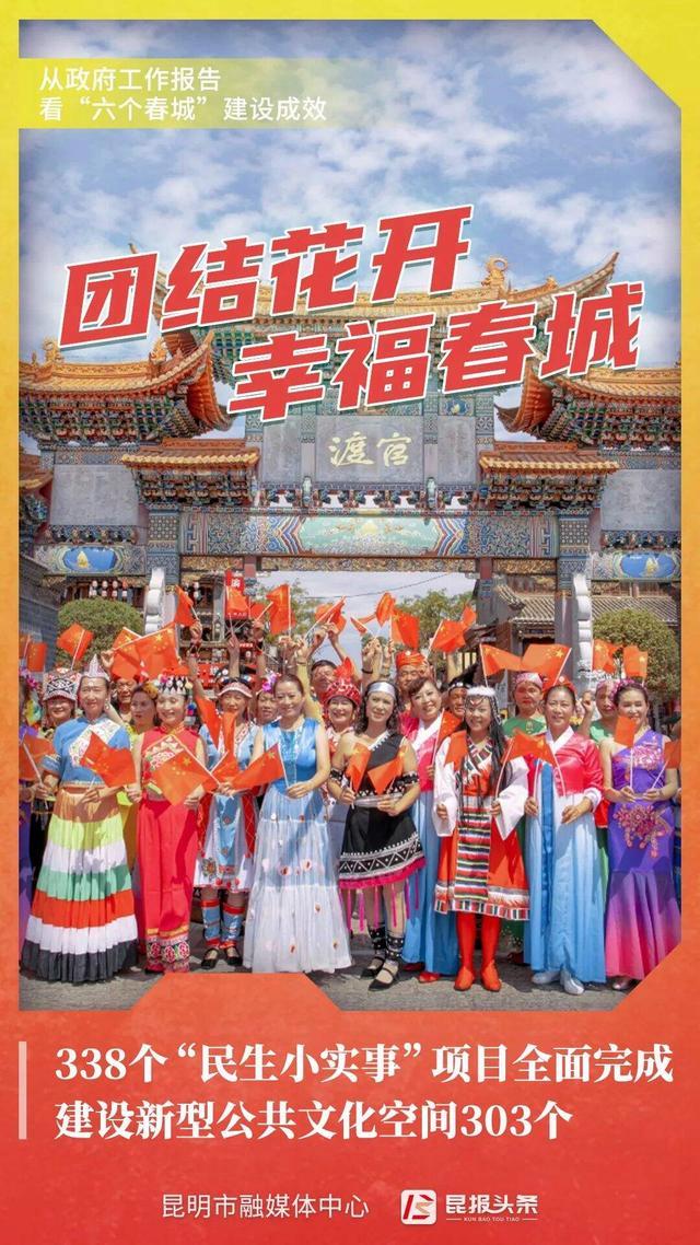 團(tuán)結(jié)花開 幸福春城338個(gè)“民生小實(shí)事”項(xiàng)目全面完成建設(shè)新型公共文化空間303個(gè)發(fā)展為了人民,發(fā)展依靠人民,發(fā)展成果由人民共享。這一年,昆明堅(jiān)持以人民為中心的發(fā)展思想,踐行共享發(fā)展理念,千方百計(jì)穩(wěn)就業(yè)、多措并舉穩(wěn)物價(jià)、用心用情辦實(shí)事,著力增強(qiáng)優(yōu)質(zhì)公共服務(wù)供給,扎實(shí)推進(jìn)共同富裕,不斷滿足人民對美好生活的需求。2023年,全市民生福祉不斷增進(jìn),74.5%的一般公共預(yù)算支出用于民生,昆明成功創(chuàng)建為全國市域社會治理現(xiàn)代化試點(diǎn)城市、首批全國社會治安防控體系建設(shè)示范城市,老百姓的幸福感、獲得感、安全感持續(xù)增強(qiáng)。過去的一年,昆明扎實(shí)開展“大調(diào)研、解難題、抓落實(shí)”工作,開設(shè)醫(yī)院夜間門診、緩解海埂大壩“觀鷗季”交通擁堵等得到人民群眾點(diǎn)贊?!笆菝駥?shí)事”全部完成,338個(gè)“民生小實(shí)事”項(xiàng)目全面完成,彰顯發(fā)展惠及于民,城市更有溫度。