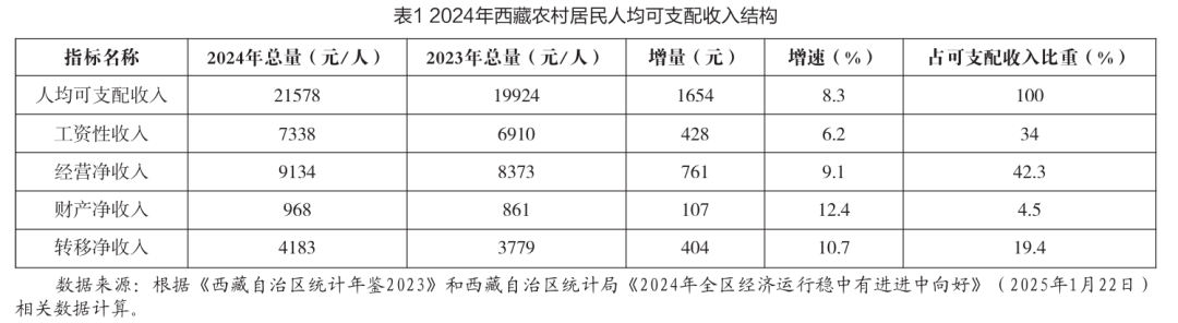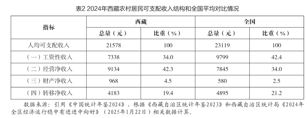 2024年西藏農(nóng)村居民四項收入穩(wěn)中有進,收入結(jié)構(gòu)不斷優(yōu)化(見表1)。與2023年相比,農(nóng)村居民工資性收入平穩(wěn)增長,增速為6.2%,穩(wěn)固了收入增長的“基本盤”。2023年轉(zhuǎn)移凈收入增長最快,為3779元,增速為14%;與2023年不同的是,2024年經(jīng)營凈收入增長最快,增速為9.1%。在轉(zhuǎn)移凈收入方面,通過持續(xù)提高各項兜底保障政策標準、及時兌現(xiàn)各類惠民補貼,農(nóng)村居民轉(zhuǎn)移凈收入增長10.7%。[5]