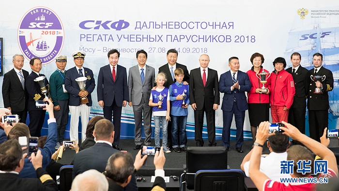 9月12日,第四屆東方經(jīng)濟(jì)論壇全會(huì)在符拉迪沃斯托克舉行。中國(guó)國(guó)家主席習(xí)近平、俄羅斯總統(tǒng)普京、蒙古國(guó)總統(tǒng)巴特圖勒嘎、日本首相安倍晉三、韓國(guó)總理李洛淵等出席。這是全會(huì)后,與會(huì)各國(guó)領(lǐng)導(dǎo)人共同出席第三屆“遠(yuǎn)東杯”國(guó)際帆船拉力賽第一賽段頒獎(jiǎng)儀式。 新華社記者黃敬文攝