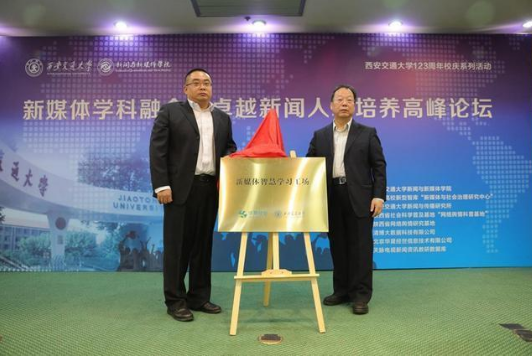 開幕式之后,西安交通大學(xué)新聞與新媒體學(xué)院院長助理張宏邦主持了校企合作簽約和揭牌儀式。西安交通大學(xué)新聞與新媒體學(xué)院院長李明德與天脈聚源電視新聞大數(shù)據(jù)中心負(fù)責(zé)人王濤簽約共建“陜西省智媒研究基地”。西安交通大學(xué)新聞與新媒體學(xué)院院長李明德與騰訊大秦網(wǎng)總裁賀柯簽約共建“陜西企鵝新媒體學(xué)院”。西安交通大學(xué)新聞與新媒體學(xué)院院長李明德與北京華晟經(jīng)世信息技術(shù)有限公司高級(jí)副總裁楊建共同為“新媒體智慧學(xué)習(xí)工場(chǎng)”揭牌。(中國日?qǐng)?bào)陜西記者站)