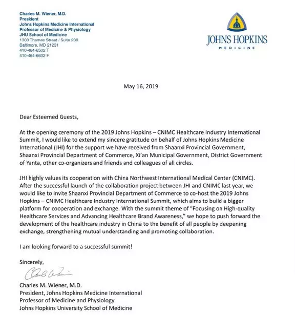 美國(guó)約翰·霍普金斯大學(xué)醫(yī)療集團(tuán)國(guó)際部總裁查爾斯維納發(fā)來的賀信。