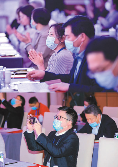 2021(第六屆)全國黨媒網(wǎng)站高峰論壇現(xiàn)場(chǎng),與會(huì)嘉賓認(rèn)真聽取發(fā)言、拍照記錄。人民網(wǎng)研究院供圖