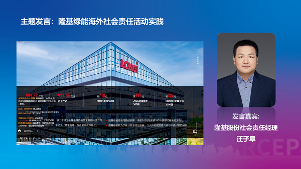 隆基綠能社會責任經(jīng)理汪子阜先生,分享了公司在光伏行業(yè)的發(fā)展歷程與業(yè)務布局,隆基以“善用太陽光芒,創(chuàng)造綠能世界”為使命,致力于推動全球綠色能源發(fā)展,業(yè)務目前已經(jīng)遍及全球150多個國家和地區(qū)。隆基作為全球光伏行業(yè)領先企業(yè),首先立足科技創(chuàng)新研發(fā)和制造高效光伏產(chǎn)品,讓全世界在碳中和時代能源轉(zhuǎn)型替代付出的代價越來越低,以企業(yè)產(chǎn)品和服務履行企業(yè)社會責任。其次,隆基積極響應聯(lián)合國2030可持續(xù)發(fā)展目標,以教育支持、氣候行動和社區(qū)發(fā)展為重點關(guān)注領域,指導和支持在東南亞地區(qū)的生產(chǎn)基地子公司,捐贈醫(yī)療設備積極參與疫情防控,在貧困學校設立獎助學金,建設學校電腦教室和校園光伏電站,獲得了當?shù)厣鐓^(qū)和政府部門的肯定,也擴大了企業(yè)在當?shù)氐氖袌銎放朴绊憽M瑫r,隆基在馬來西亞子公司對當?shù)卮髮W的學生科技創(chuàng)新和專業(yè)教育提供支持,為當?shù)嘏囵B(yǎng)更多的新能源人才,助力當?shù)氐哪茉崔D(zhuǎn)型與綠色發(fā)展。